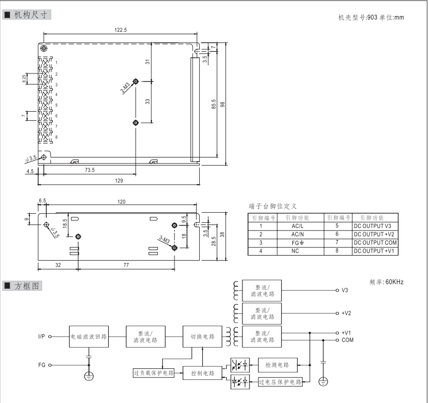 | 输出电压 | 5/15/-15VDC | 效率 | 78 % |