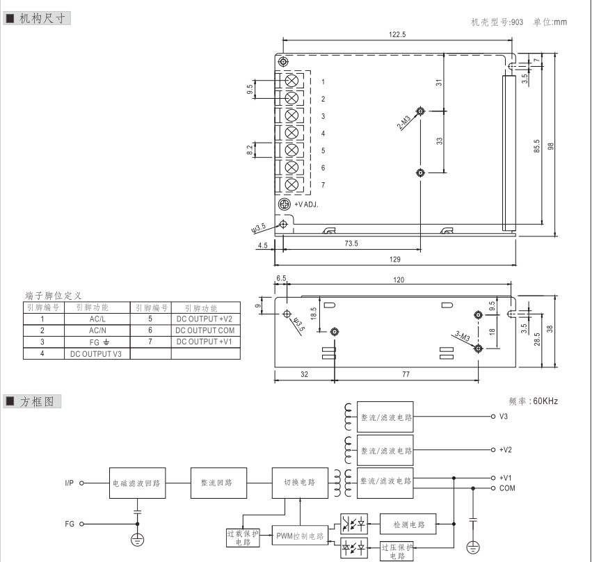| 输出电压 | 5/12/-5VDC | 效率 | 76 % |